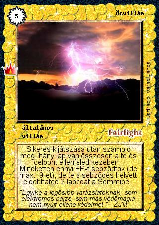 Kiadás: Ősi legendák Gyakoriság: ritka Lapszín (isten): Fairlight Típus: általános Altípus: villám Szöveg: Sikeres kijátszása után számold meg, hány lap van összesen a te és célpont ellenfeled kezében. Mindketten ennyi ÉP-t sebződtök (de max. 9-et), de te a sebződés helyett eldobhatod 2 lapodat a Semmibe. Szinesítő szöveg: "Egyike a legősibb varázslatoknak, sem elektromos pajzs, sem más védőmágia nem nyújt ellene védelmet." - Zu'lit Illusztráció: Váradi János