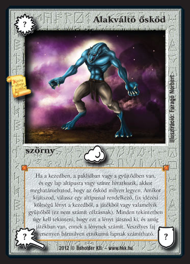 Kiadás: Istenek viadala Gyakoriság: ultra ritka Lapszín (isten): Színtelen Típus: szörny Altípus: morf Szöveg: Ha a kezedben, a paklidban vagy a gyűjtődben van, és egy lap altípusra vagy színre hivatkozik, akkor meghatározhatod, hogy az ősköd milyen legyen. Amikor kijátszod, válassz egy altípussal rendelkező, fix idézési költségű lényt a kezedből, a játékból vagy valamelyik gyűjtőből (ez nem számít célzásnak). Minden tekintetben úgy kell tekinteni, hogy ezt a lényt játszod ki, és amíg játékban van, ennek a lénynek számít. Veszélyes faj versenyen bármilyen etnikumú lapnak számítható. Veszélyes faj versenyen bármilyen etnikumú lapnak számítható. Illusztráció: Faragó Norbert