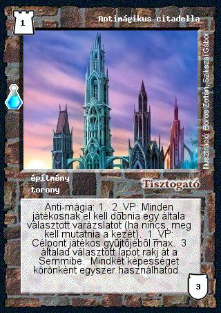 Kiadás: Esthar Császárság Gyakoriság: nem gyakori Lapszín (isten): Tisztogató Klán Típus: építmény Altípus: torony Szöveg: Anti-mágia: 1. 2 VP: Minden játékosnak el kell dobnia egy általa választott varázslatot (ha nincs, meg kell mutatnia a kezét). 1 VP: Célpont játékos gyűjtőjéből max. 3 általad választott lapot rakj át a Semmibe. Mindkét képességet körönként egyszer használhatod. Illusztráció: Boros Zoltán, Szikszai Gábor