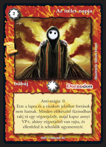 Kiadás: Misztikus Erők Gyakoriság: ultra ritka Lapszín (isten): Dornodon Típus: bűbáj Szöveg: Anti-mágia: 0. Erre a lapra és a rárakott jelzőkre források nem hatnak. Minden előkészítő fázisodban rakj rá egy végzetjelzőt, majd kapsz annyi VP-t, ahány végzetjelző van rajta, és ellenfeled is sebződik ugyanennyit. Illusztráció: Baross Ferenc