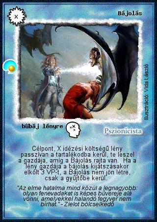 Kiadás: Két világ közt, Alappakli, 6. kiadás (Ősök Városa), Alappakli, 7. kiadás (Ősök Városa) Gyakoriság: ritka Lapszín (isten): Pszionicista Klán Típus: bűbáj lényre Szöveg: Célpont, X idézési költségű lény passzívan a tartalékodba kerül, te leszel a gazdája, amíg a Bájolás rajta van. Ha a lény gazdája a bájolás kijátszásakor elkölt 3 VP-t, a Bájolás nem jön létre, csak a gyűjtőbe kerül. Szinesítő szöveg: "Az elme hatalma mind közül a legnagyobb: olyan fenevadakat is képes bűvereje alá vonni, amelyekkel halandó fegyver nem bírhat." - Zielot bölcselkedő Illusztráció: Vida László