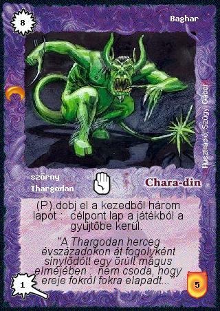 Kiadás: Chara-din visszatér Gyakoriság: ritka Lapszín (isten): Chara-din Típus: szörny Altípus: Thargodan Szöveg: (P),dobj el a kezedből három lapot: célpont lap a játékból a gyűjtőbe kerül. Szinesítő szöveg: "A Thargodan herceg évszázadokon át fogolyként sínylődött egy őrült mágus elméjében: nem csoda, hogy ereje fokról fokra elapadt..." Illusztráció: