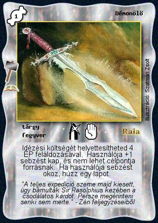 Kiadás: Zarknod műhelye (Zén), Alappakli, 8. kiadás Gyakoriság: ritka Lapszín (isten): Raia Típus: tárgy Altípus: fegyver Szöveg: Idézési költségét helyettesítheted 4 ÉP feláldozásával. Használója +1 sebzést kap, és nem lehet célpontja forrásnak. Ha használója sebzést okoz, húzz egy lapot. Szinesítő szöveg: "A teljes expedíció szeme majd kiesett, úgy bámulták Sir Rasolphius kezében a csodálatos kardot. Persze megérinteni senki sem merte." - Zén feljegyzéseiből Illusztráció: Szatmári Zsolt