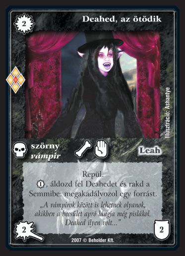 Kiadás: Misztikus Erők Gyakoriság: ritka Lapszín (isten): Leah Típus: szörny Altípus: vámpír Szöveg: Repül. 1_VP, áldozd fel Deahedet és rakd a Semmibe: megakadályozol egy forrást. Szinesítő szöveg: "A vámpírok között is lehetnek olyanok, akikben a becsület apró lángja még pislákol. Deahed ilyen volt..." Illusztráció: Ashantye