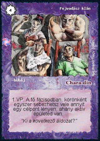 Kiadás: Létsíkok Gyakoriság: nem gyakori Lapszín (isten): Chara-din Típus: bűbáj Szöveg: 1 VP: A fő fázisodban, körönként egyszer sebezhetsz vele annyit egy célpont lényen, ahány aktív épületed van. Szinesítő szöveg: "Ki a következő áldozat?" Illusztráció: Nagy Zoltán