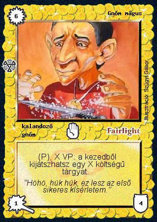 Kiadás: Isteni szövetség Gyakoriság: gyakori Lapszín (isten): Fairlight Típus: kalandozó Altípus: gnóm Szöveg: (P), X VP: a kezedből kijátszhatsz egy X költségű tárgyat. Szinesítő szöveg: "Höhö, hük hük, ez lesz az első sikeres kísérletem." Illusztráció: