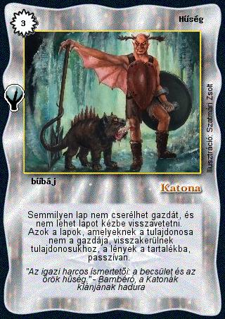 Kiadás: Alappakli, 5. kiadás (Ősök városa) Gyakoriság: nem gyakori Lapszín (isten): Katona Klán Típus: bűbáj Szöveg: Semmilyen lap nem cserélhet gazdát, és nem lehet lapot kézbe visszavetetni. Azok a lapok, amelyeknek a tulajdonosa nem a gazdája, visszakerülnek tulajdonosukhoz, a lények a tartalékba, passzívan. Szinesítő szöveg: "Az igazi harcos ismertetői: a becsület és az örök hűség." - Bambéró, a Katonák klánjának hadura Illusztráció: Szatmári Zsolt