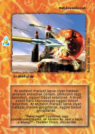 Kiadás: Víziók Gyakoriság: ritka Lapszín (isten): Nincs Típus: szabálylap Szöveg: Az asztalon maradó lapok olyan hatásai, amelyek sebeznek (lényen, játékoson vagy épületen), eggyel többet sebeznek. A direkt sebző harci képességek eggyel többet sebeznek. Az asztalon maradó lapok olyan hatásai, melyek gyógyítanak, eggyel többet gyógyítanak. Szinesítő szöveg: "Nevezhetjük csalásnak vagy szemfényvesztésnek, de kérdem én: nem a hatás a lényeg?" - Fealefel Throm, illuzionista Illusztráció: Markó Gábor