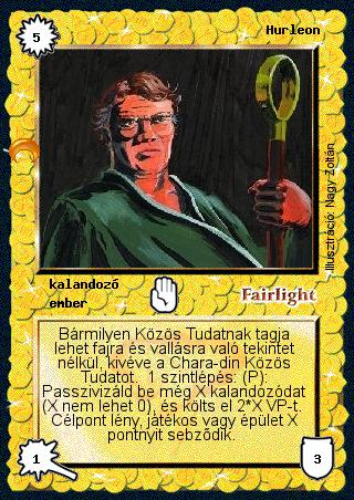 Kiadás: Chara-din visszatér Gyakoriság: nem gyakori Lapszín (isten): Fairlight Típus: kalandozó Altípus: ember Szöveg: Bármilyen Közös Tudatnak tagja lehet fajra és vallásra való tekintet nélkül, kivéve a Chara-din Közös Tudatot. 1 szintlépés: (P): Passzivizáld be még X kalandozódat (X nem lehet 0), és költs el 2*X VP-t. Célpont lény, játékos vagy épület X pontnyit sebződik. Illusztráció: Nagy Zoltán