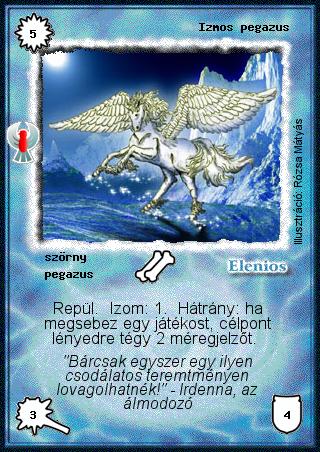 Kiadás: Ébredés Gyakoriság: nem gyakori Lapszín (isten): Elenios Típus: szörny Altípus: pegazus Szöveg: Repül. Izom: 1. Hátrány: ha megsebez egy játékost, célpont lényedre tégy 2 méregjelzőt. Szinesítő szöveg: "Bárcsak egyszer egy ilyen csodálatos teremtményen lovagolhatnék!" - Irdenna, az álmodozó Illusztráció: Rózsa Mátyás