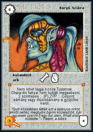 Kiadás: Chara-din visszatér Gyakoriság: ritka Lapszín (isten): Színtelen Típus: kalandozó Altípus: ork Szöveg: Nem lehet tagja Közös Tudatnak. Chara-din fattyai nem tudják megsebezni. 2 szintlépés: (P),2VP: Célpont sárkány vagy illúziósárkány a gyűjtőbe kerül. Szinesítő szöveg: "Qvill közelében látták ezt a talányos orkot, akiről nehéz megtudni bármi közelebbit, bár egyesek szerint ő egy ősi isten, Rhatt első küldötte." - Treem, a bölcs Illusztráció: Lipták László