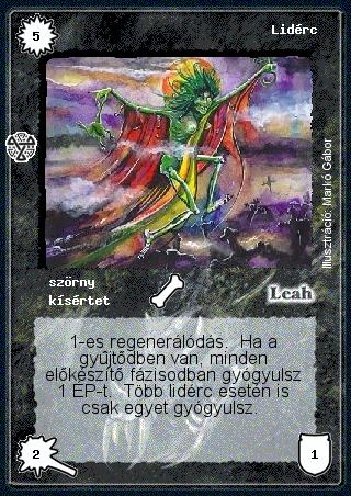 Kiadás: Isteni szövetség Gyakoriság: nem gyakori Lapszín (isten): Leah Típus: szörny Altípus: kísértet Szöveg: 1-es regenerálódás. Ha a gyűjtődben van, minden előkészítő fázisodban gyógyulsz 1 ÉP-t. Több lidérc esetén is csak egyet gyógyulsz. Illusztráció: Markó Gábor