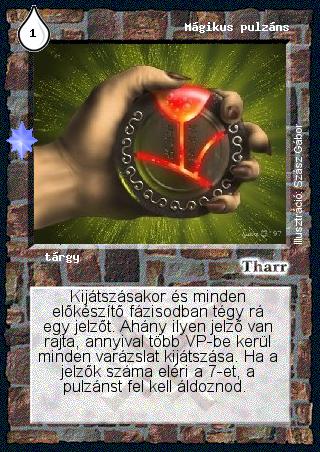 Kiadás: Ezüsthajnal, Túlélők Földje Gyakoriság: ritka Lapszín (isten): Tharr Típus: tárgy Szöveg: Kijátszásakor és minden előkészítő fázisodban tégy rá egy jelzőt. Ahány ilyen jelző van rajta, annyival több VP-be kerül minden varázslat kijátszása. Ha a jelzők száma eléri a 7-et, a pulzánst fel kell áldoznod. Illusztráció: Szász Gábor