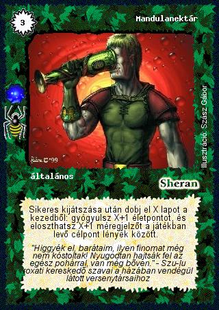 Kiadás: Földanya paradicsoma (Invázió), Túlélők Földje Gyakoriság: ritka Lapszín (isten): Sheran Típus: általános Szöveg: Sikeres kijátszása után dobj el X lapot a kezedből: gyógyulsz X+1 életpontot, és eloszthatsz X+1 méregjelzőt a játékban levő célpont lények között. Szinesítő szöveg: "Higgyék el, barátaim, ilyen finomat még nem kóstoltak! Nyugodtan hajtsák fel az egész pohárral, van még bőven." - Szu-lu roxati kereskedő szavai a házában vendégül látott versenytársaihoz Illusztráció: Szász Gábor