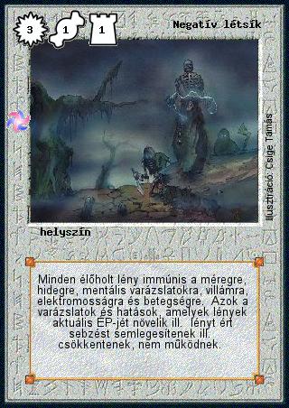 Kiadás: Létsíkok, Túlélők Földje Gyakoriság: nem gyakori Lapszín (isten): Színtelen Típus: helyszín Szöveg: Minden élőholt lény immúnis a méregre, hidegre, mentális varázslatokra, villámra, elektromosságra és betegségre. Azok a varázslatok és hatások, amelyek lények aktuális ÉP-jét növelik ill. lényt ért sebzést semlegesítenek ill. csökkentenek, nem működnek. Illusztráció: Csige Tamás