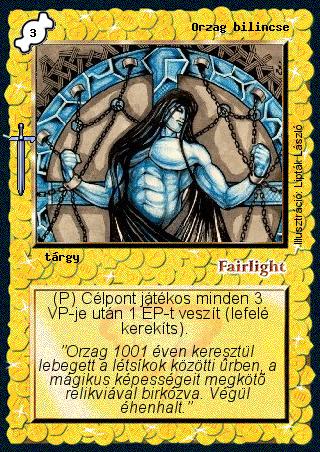 Kiadás: Hőskorszak, Védnök 2021 Gyakoriság: ritka Lapszín (isten): Fairlight Típus: tárgy Szöveg: (P) Célpont játékos minden 3 VP-je után 1 ÉP-t veszít (lefelé kerekíts). Szinesítő szöveg: "Orzag 1001 éven keresztül lebegett a létsíkok közötti űrben, a mágikus képességeit megkötő relikviával birkózva. Végül éhenhalt." Illusztráció: Lipták László