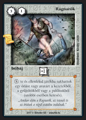 Kiadás: Gemina Erdeje Gyakoriság: ultra ritka Lapszín (isten): Színtelen Típus: bűbáj Szöveg: (S): te és ellenfeled játékba rakhattok egy óriást vagy avatárt a kezetekből, a gyűjtőtökből vagy a paklitokból (utóbbi esetben keresés). Szinesítő szöveg: "Amikor eljön a Ragnarök, az istenek és az óriások a végső csatába indulnak." Illusztráció: Kicsiny László