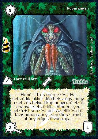 Kiadás: Rúvel hegy, Alappakli, 6. kiadás (Ősök Városa), Alappakli, 7. kiadás (Ősök Városa) Gyakoriság: ritka Lapszín (isten): Tudós Klán Típus: torzszülött Szöveg: Repül. 1-es mérgezés. Ha sebződik, akkor dönthetsz úgy, hogy a sebzés helyett kap annyi erőjelzőt, ahányat sebződött. Minden ilyen jelző +1 sebzést ad. Az előkészítő fázisodban annyit sebződsz, mint ahány erőjelző van rajta. Illusztráció: Szatmári Zsolt