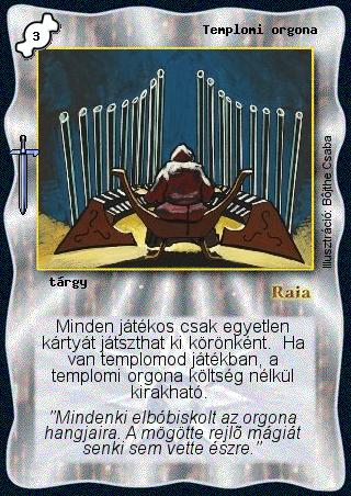 Kiadás: Hőskorszak, Védnök 2025 Gyakoriság: ritka Lapszín (isten): Raia Típus: tárgy Szöveg: Minden játékos csak egyetlen kártyát játszthat ki körönként. Ha van templomod játékban, a templomi orgona költség nélkül kirakható. Szinesítő szöveg: "Mindenki elbóbiskolt az orgona hangjaira. A mögötte rejlő mágiát senki sem vette észre." Illusztráció: Bőjthe Csaba