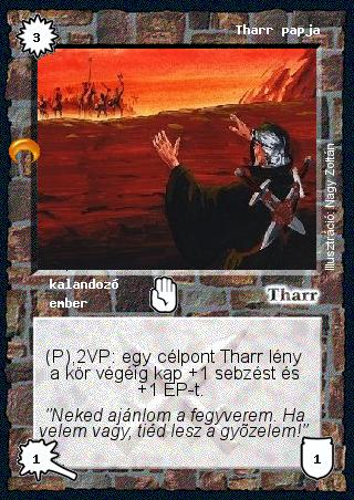 Kiadás: Chara-din visszatér Gyakoriság: gyakori Lapszín (isten): Tharr Típus: kalandozó Altípus: ember Szöveg: (P),2VP: egy célpont Tharr lény a kör végéig kap +1 sebzést és +1 ÉP-t. Szinesítő szöveg: "Neked ajánlom a fegyverem. Ha velem vagy, tiéd lesz a győzelem!" Illusztráció: Nagy Zoltán