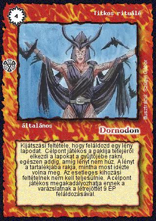 Kiadás: Isteni szövetség, Túlélők Földje Gyakoriság: ritka Lapszín (isten): Dornodon Típus: általános Szöveg: Kijátszási feltétele, hogy feláldozd egy lény lapodat. Célpont játékos a paklija tetejéről elkezdi a lapokat a gyűjtőjébe rakni, egészen addig, amíg lényt nem húz. A lényt a tartalékjába rakja, mintha most idézte volna meg. Az esetleges kihozási feltételnek nem kell teljesülnie. A célpont játékos megakadályozhatja ennek a varázslatnak a létrejöttét 9 ÉP feláldozásával. Illusztráció:
