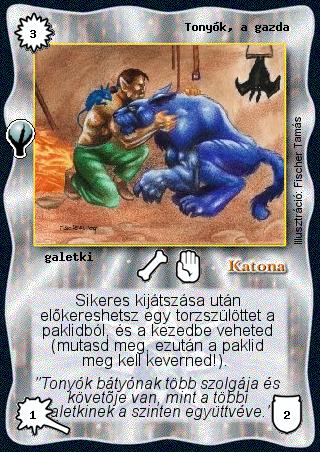 Kiadás: Alappakli, 5. kiadás (Ősök városa), Alappakli, 6. kiadás (Ősök Városa), Alappakli, 7. kiadás (Ősök Városa) Gyakoriság: nem gyakori Lapszín (isten): Katona Klán Típus: galetki Szöveg: Sikeres kijátszása után előkereshetsz egy torzszülöttet a paklidból, és a kezedbe veheted (mutasd meg, ezután a paklid meg kell keverned!). Szinesítő szöveg: "Tonyók bátyónak több szolgája és követője van, mint a többi galetkinek a szinten együttvéve." Illusztráció: Fischer Tamás