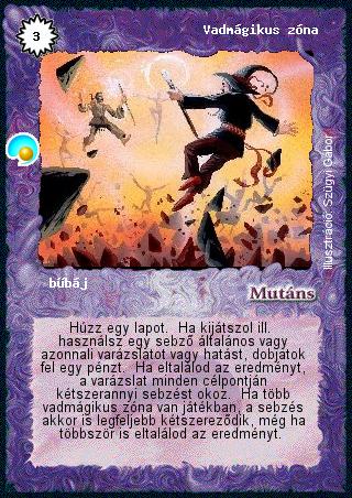 Kiadás: Két világ közt Gyakoriság: ritka Lapszín (isten): Mutáns Klán Típus: bűbáj Szöveg: Húzz egy lapot. Ha kijátszol ill. használsz egy sebző általános vagy azonnali varázslatot vagy hatást, dobjatok fel egy pénzt. Ha eltalálod az eredményt, a varázslat minden célpontján kétszerannyi sebzést okoz. Ha több vadmágikus zóna van játékban, a sebzés akkor is legfeljebb kétszereződik, még ha többször is eltalálod az eredményt. Illusztráció: