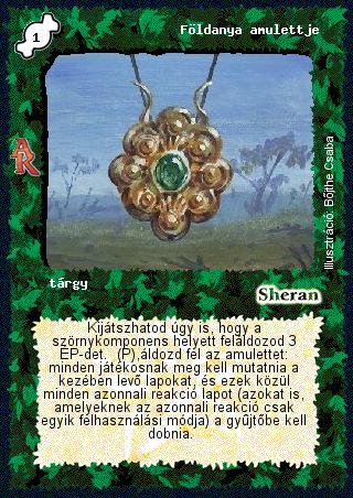 Kiadás: Alanori Krónika, TF találkozó Gyakoriság: ritka Lapszín (isten): Sheran Típus: tárgy Szöveg: Kijátszhatod úgy is, hogy a szörnykomponens helyett feláldozod 3 ÉP-det. (P),áldozd fel az amulettet: minden játékosnak meg kell mutatnia a kezében levő lapokat, és ezek közül minden azonnali reakció lapot (azokat is, amelyeknek az azonnali reakció csak egyik felhasználási módja) a gyűjtőbe kell dobnia. Illusztráció: Bőjthe Csaba