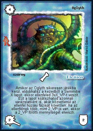 Kiadás: Alanori Krónika Gyakoriság: ritka Lapszín (isten): Elenios Típus: szörny Szöveg: Amikor az Oglyth sikeresen játékba kerül, eldobhatsz a kezedből a Semmibe X lapot: ekkor ellenfeled 3xX VP-t veszít. Ezt a lapot kijátszhatod azonnali varázslatként is, akár közvetlenül az ellenfél húzási fázisát követően: ha az ellenfélnek több, mint 2 VP-je van, akkor a 2 VP fölötti mennyiséget elveszti. Illusztráció: Markó Gábor