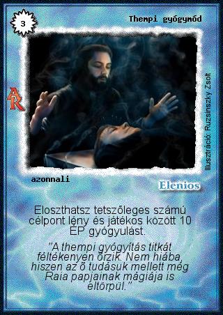 Kiadás: Alanori Krónika Gyakoriság: ritka Lapszín (isten): Elenios Típus: azonnali Szöveg: Eloszthatsz tetszőleges számú célpont lény és játékos között 10 ÉP gyógyulást. Szinesítő szöveg: "A thempi gyógyítás titkát féltékenyen őrzik. Nem hiába, hiszen az ő tudásuk mellett még Raia papjainak mágiája is eltörpül." Illusztráció: Ruzsinszki Zsolt