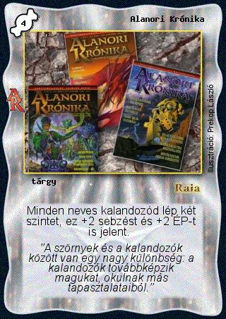 Kiadás: Alanori Krónika Gyakoriság: ritka Lapszín (isten): Raia Típus: tárgy Szöveg: Minden neves kalandozód lép két szintet, ez +2 sebzést és +2 ÉP-t is jelent. Szinesítő szöveg: "A szörnyek és a kalandozók között van egy nagy különbség: a kalandozók továbbképzik magukat, okulnak más tapasztalataiból." Illusztráció: Prekop László